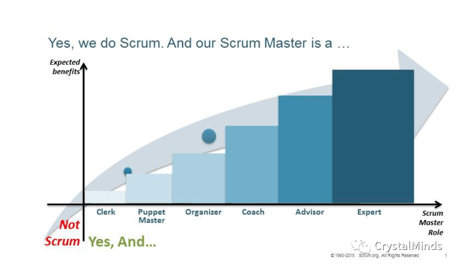 对于Scrum Master来说,可能会经历从书记员、组织者,到教练、顾问等角色,最后将会成长为敏捷专家;
