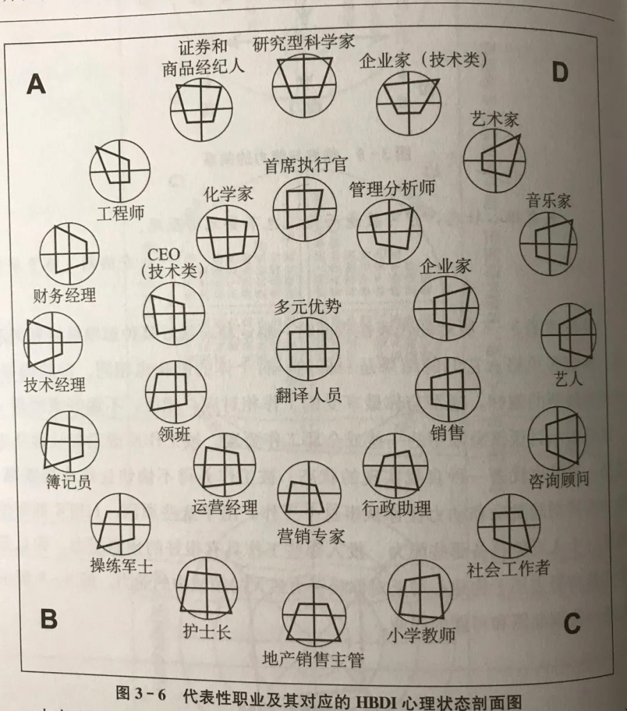 再对照下面的全脑模型的职业分布图,就更加一目了然:在自然状态下,与我的脑图最匹配的职业是以C脑为主的教学、辅导、发展,同时配合D脑的销售、咨询、艺术、创业等;而在压力状态下,与我的脑图最匹配的职业是法律、医学、技术、理论,同时配合D脑的销售、咨询、创业等。
