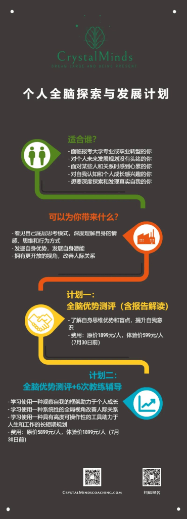 如果你是一名即将面临选择文理科的学生,或是面临选择大学专业的高中毕业生,抑或是面临职业选择的大学毕业生,你是否想要在人生更早的阶段对自己的用脑偏好有所了解?还是想要依赖父母的建议,或凭着自己现阶段对自己的认知来一步步摸索和尝试,慢慢找到你的真正的偏好和最适合你的发展模式?