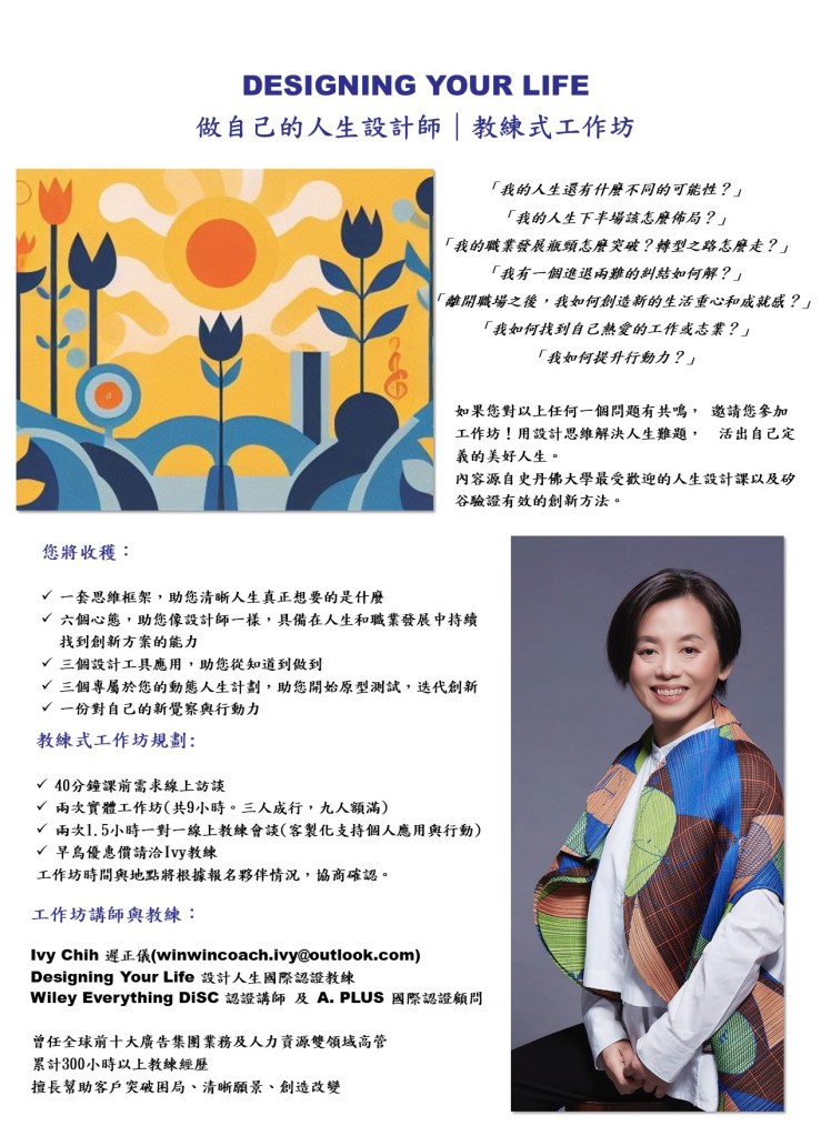 「做自己的人生設計師」工作坊講師與一對一教練(內容源自史丹佛大學最受歡迎的人生設計課)